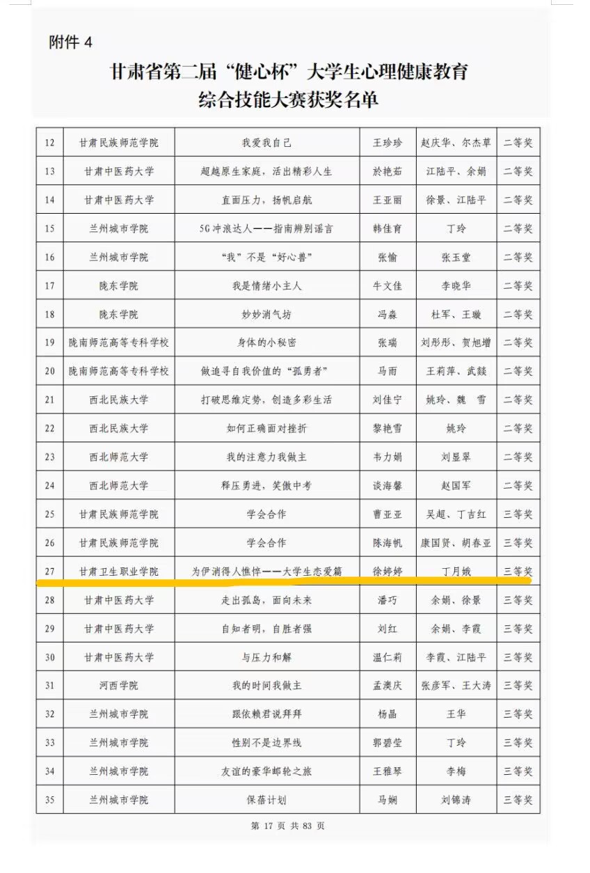 2022年10月15日,由甘肃省教育厅主办、西北师范大学心理学院和甘肃省心理学会联合承办的甘肃省大学生“健心杯”心理健康教育综合技能大赛落下帷幕,比赛结果拟推荐获奖名单于11月下旬公示10日,现已审核通过并公布,365英国由心理健康教育中心主任丁月娥老师指导的徐婷婷同学在本次活动中取得了省级三等奖的优秀成绩。