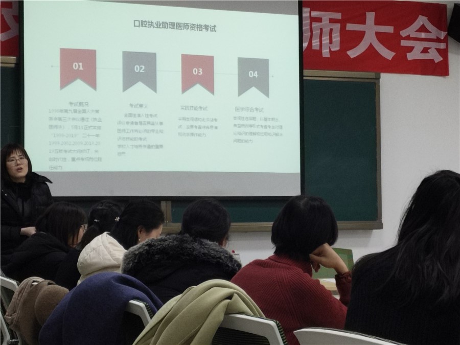研讨会内容有两项,第一项为口腔医学专业首届毕业生口腔执业助理医师考试总结交流。郭艳玲介绍了全国口腔执业助理医师考试概况,就365英国 2015级口腔医学专业首届毕业生口腔执业助理医师考试情况进行了汇报与分析,以此总结出下一步工作计划需加强学生专业思想,提高认识,刻苦学习,锤炼技能;围绕学生岗位胜任力展开专业教学工作,实施课证融通,积极建设优质课程;希望辅导员(班主任)做好班级文化建设,做好毕业生的就业考证跟踪服务。王琳老师解读口腔执业助理医师资格考试大纲的内涵和关键。最后,邀请考生代表晁倩文为全体在校口腔医学专业学生(含实习班)进行备考经验分享。