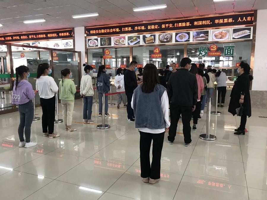 活动最后,全体人员到餐厅协助后勤工作人员维持学生就餐秩序,学生排队买餐时,必须保持一米间距,依序由入口进入餐厅,取餐后按照地面标线指示方向出餐厅,鼓励同学们打包外带,堂食的同学要做到单人单桌就餐。