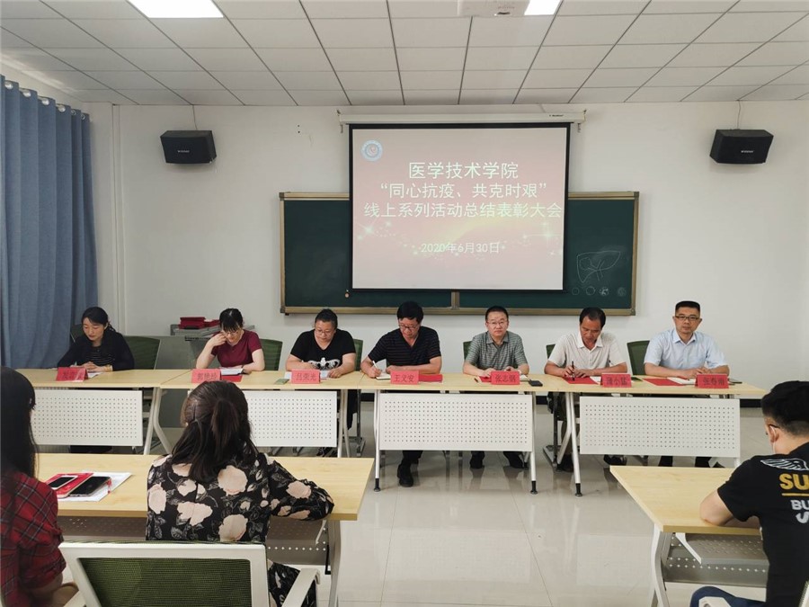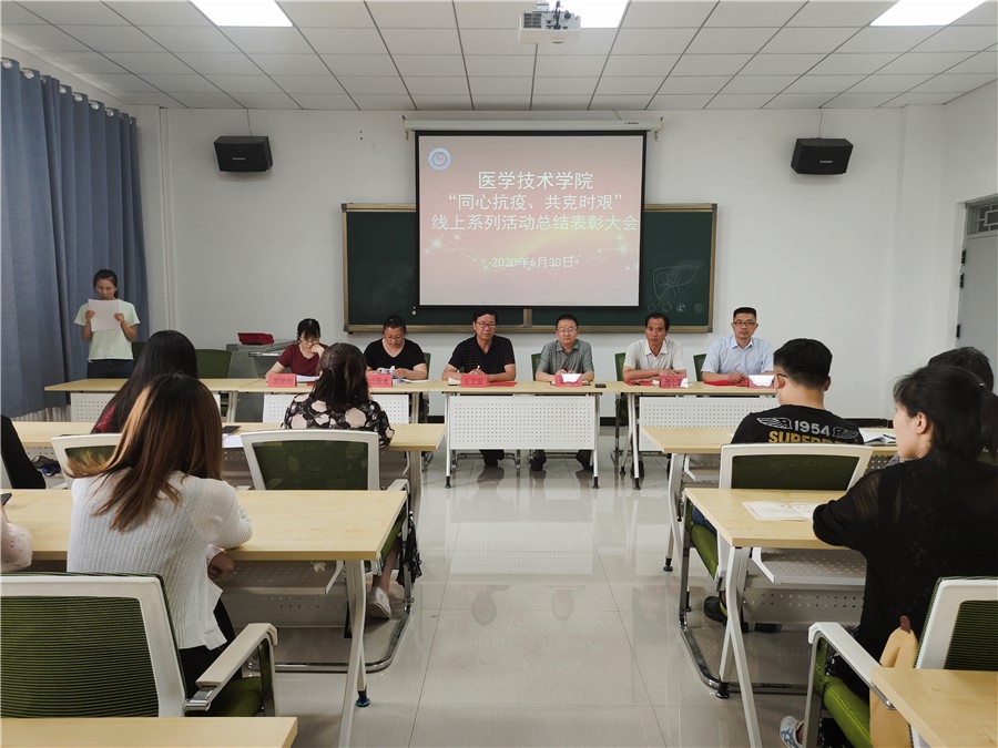 医学技术学院在疫情防控期间,为充分激发和调动全院师生积极参加抗疫行动,投入学院教学育人活动的积极性和热情,助推学院在疫情防控期间的各项工作积极向上开展,使学院的建设发展不停步、不减效,取得学院疫情防控和常规建设发展工作两手抓、两不误、两促进的良好效果,开展了以“同心抗疫、共克时艰”为主题的抗疫行动线上系列专题活动。系列活动共有五项内容,分别是线上论坛、师生微视频大赛、师生医学专业绘画大赛、师生抗疫征文大赛及师生硬笔书法大赛。活动开展以来,学院师生积极参与,取得良好效果,为总结活动取得的成绩和经验,表彰活动中涌现出的先进个人,6月30日下午,学院在学院会议室召开“同心抗疫、共克时艰”线上系列活动总结表彰大会,全体院领导、专兼职教师、辅导员及学生获奖代表参加,会议由院长张志钢主持。