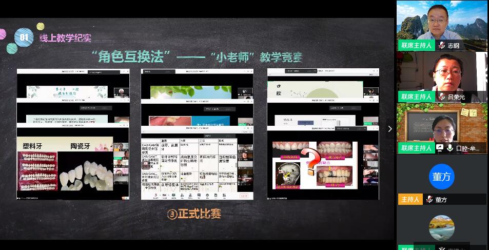 牟星老师结合自己线上教学七周来的教学实践和体验总结,从四个方面展开讲座。一是线上教学纪实,交流了线上教学的前期准备、授课方法及多平台考评方法,详细介绍了独具特色的“角色互换”教学法;二是线上教学反馈,对两门口腔医学专业主修课程开展的学生满意度问卷调查进行了总结分析;三是线上教学反思,分别从“角色互换”反思、线上教学优势、线上教学劣势、混合教学模式四个角度进行了阐述;四是与线下教学的衔接,分别从教学进度、授课计划、实验安排及近2周教学准备等层面阐述了与线下教学衔接的问题。讲座条理清晰、内容扎实实用,对正在开展的线上教学有很好的指导作用,得到了与会者的一致好评。