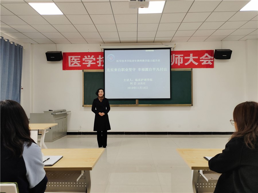 11月18日下午,医学技术学院在学院会议室开展了“青年教师教学能力提升班”第七次讲座。临床护理学院何岩副教授作了“充实来自职业坚守,幸福源自平凡付出”为主题的讲座,全体培训班成员参加了本次培训。